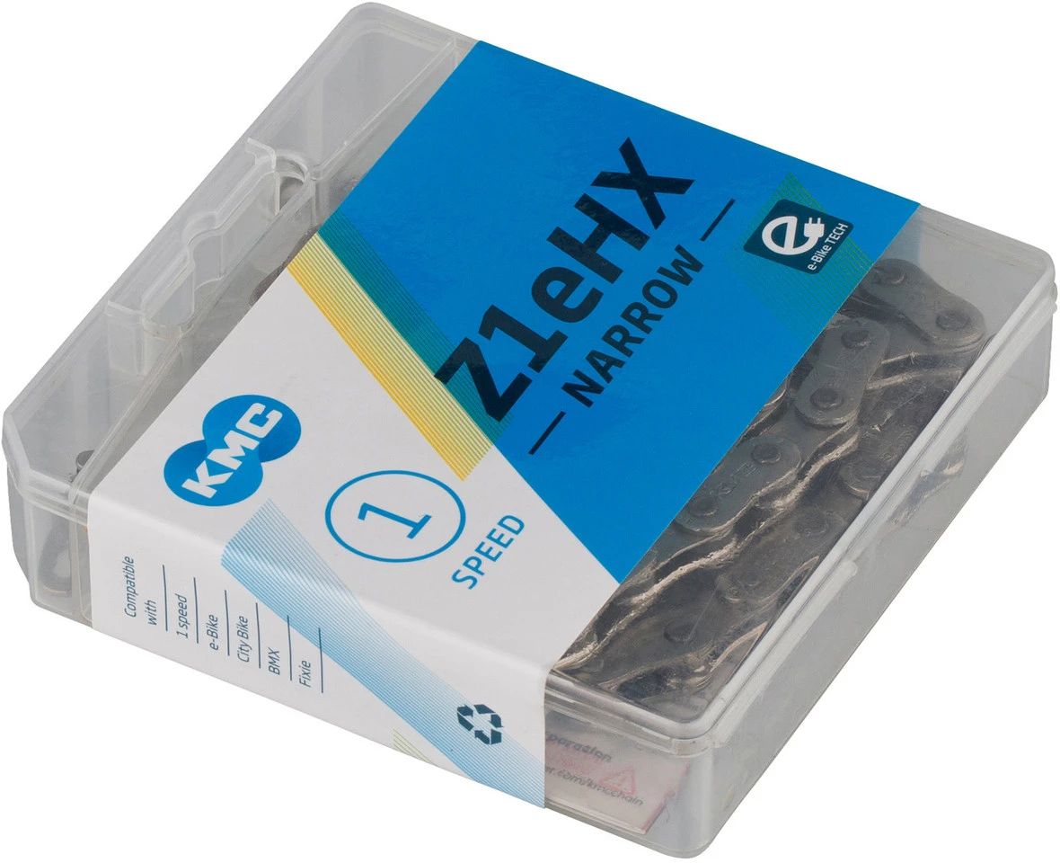 Die KMC Z1eHX Narrow 1-fach Kette ist eine Heavy-Duty-Kette für besonders schwere Beanspruchung. Sie eignet sich damit perfekt für Räder mit Nabenschaltung, Fixies, E-Bikes, Bahnräder oder BMX Bikes. Es gibt eine Version mit Nickelbeschichtung (silver) und 112 Gliedern und eine Version mit EcoProTeQ Antirost Technologie (ept silver) und 128 Gliedern.
