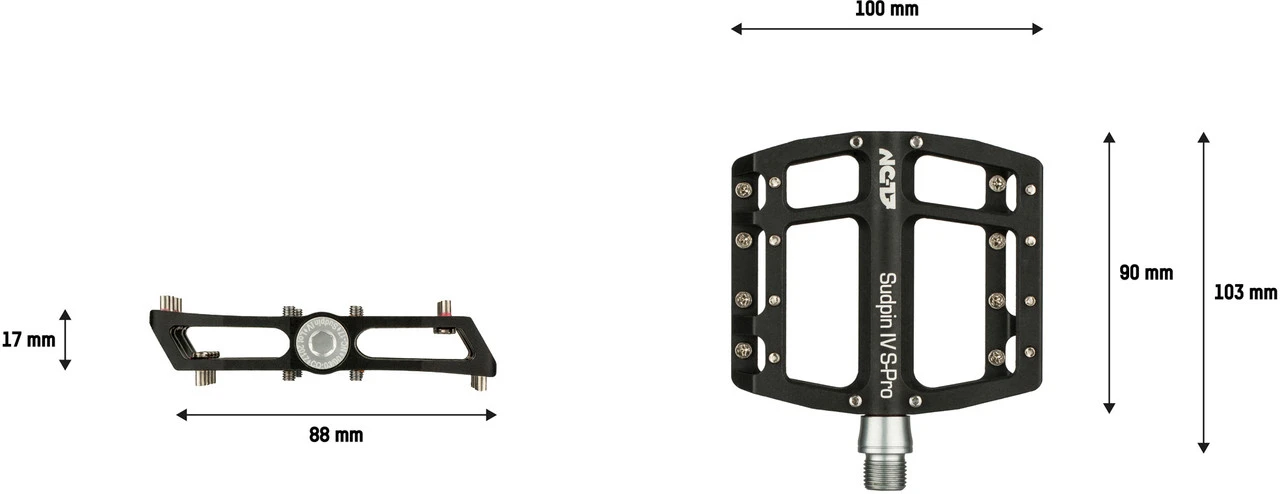 Spezifikationen:Einsatzbereich:All Mountain, TrailAusführung:PlattformpedaleTechnische Daten:Material Pedalkörper:Aluminium (7075-T6)Material Achse:Stahl (CrMo)Lagerung:PräzisionslagerBauhöhe:15 mmAbmessungen (Länge x Breite):100 x 90 mmAnzahl Pins:24Features:CNC-gefertigte Aluminium-Plattformmit 2 gedichteten PräzisionslagernFail Safe Systemmit Lasergravur und Identifikationsnummer24 austauschbare Pins (pro Pedal)Herstellernummern:schwarz:7055weiß:7056rot:7057grün:7058poliert:7059blau:7060gold:7061Lieferumfang:1 Paar Plattformpedale NC-17 Sudpin IV S-Pro (rechts und links)inkl. Ersatzpins