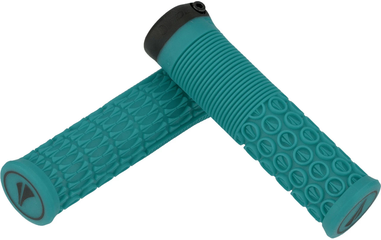 Die SDG Thrice Lock-On Lenkergriffe mit einem Durchmesser von 33 mm besitzen ein ergonomisches Griffmuster mit tiefen Noppen, was für einen ausgezeichneten Griff an den Fingern sorgt. Das runde SDG-Icon Muster auf der Grifffläche dient dabei zur besseren Dämpfung und Druckverteilung.